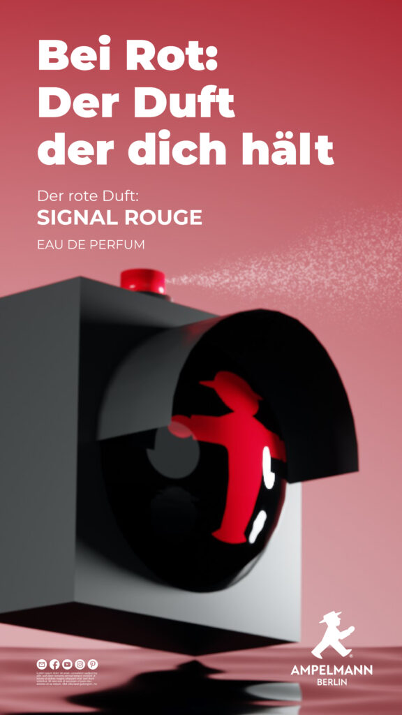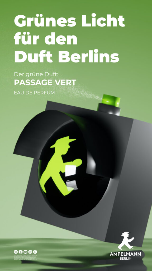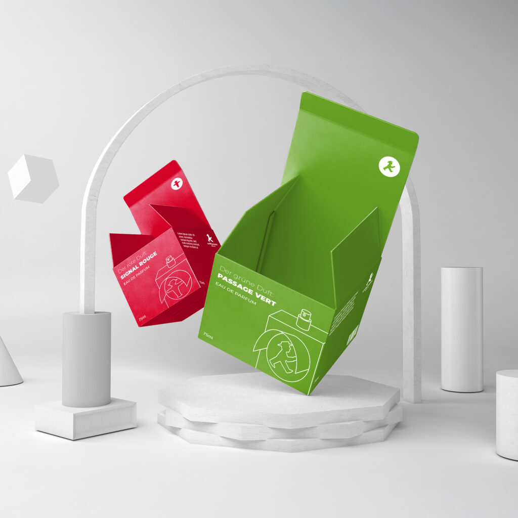 Bei der Konzeption der beiden Parfums stand für mich die Verbindung zweier Welten im Fokus: die charmante, zugängliche Identität von AMPELMANN und das hochwertige, luxoriöse Gefühl eines Parfums. Gerade dieser Kontrast hat mich besonders gereizt. Der Flakon greift formal die klare, ikonische Geometrie eines Ampelgehäuses auf, übersetzt diese jedoch in eine eigenständige, reduzierte Form. Ziel war es, ein Objekt zu schaffen, das sowohl funktionale Vertrautheit als auch gestalterische Einzigartigkeit vermittelt. Auch die Namensgebung folgt diesem Prinzip: PASSAGE VERT und SIGNAL ROUGE verbinden französische Begriffe – als Referenz an die klassische Parfumwelt – mit Elementen aus dem urbanen Raum und dem Straßenverkehr. Eine Kombination zweier Welten in mehrerer Hinsicht.