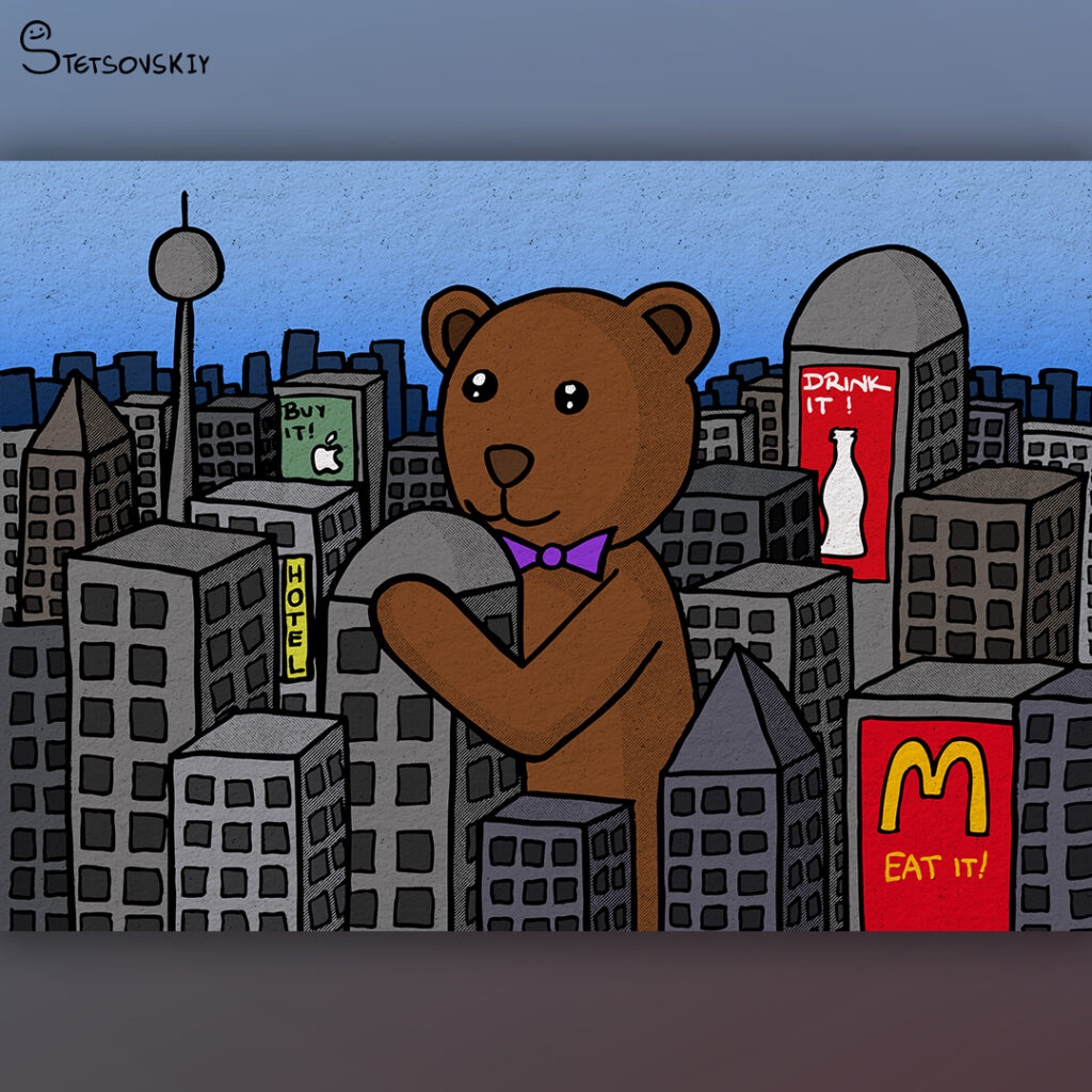 Ein riesiger Teddy in einer stressigen lauten Großstadt. Zwischen Hochhäusern und Werbeplakaten ist da eine kuschelige Umarmung.
